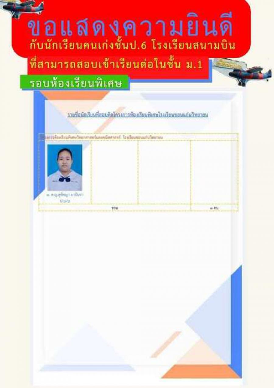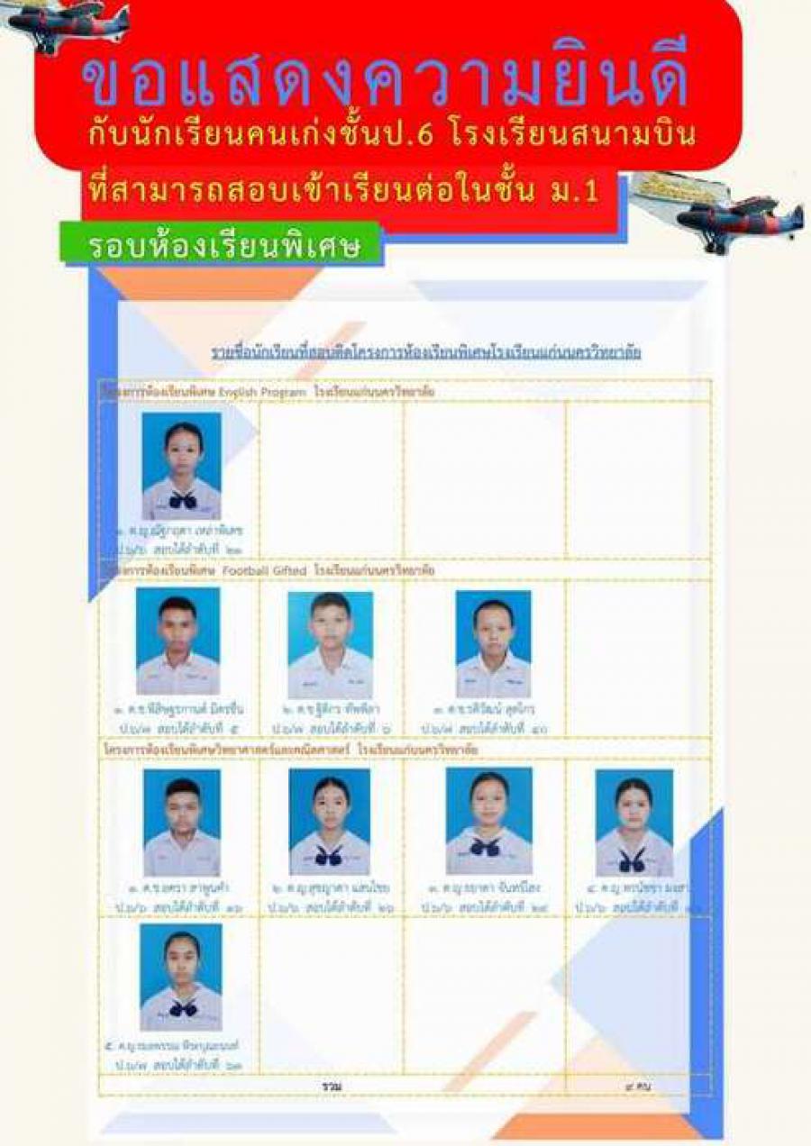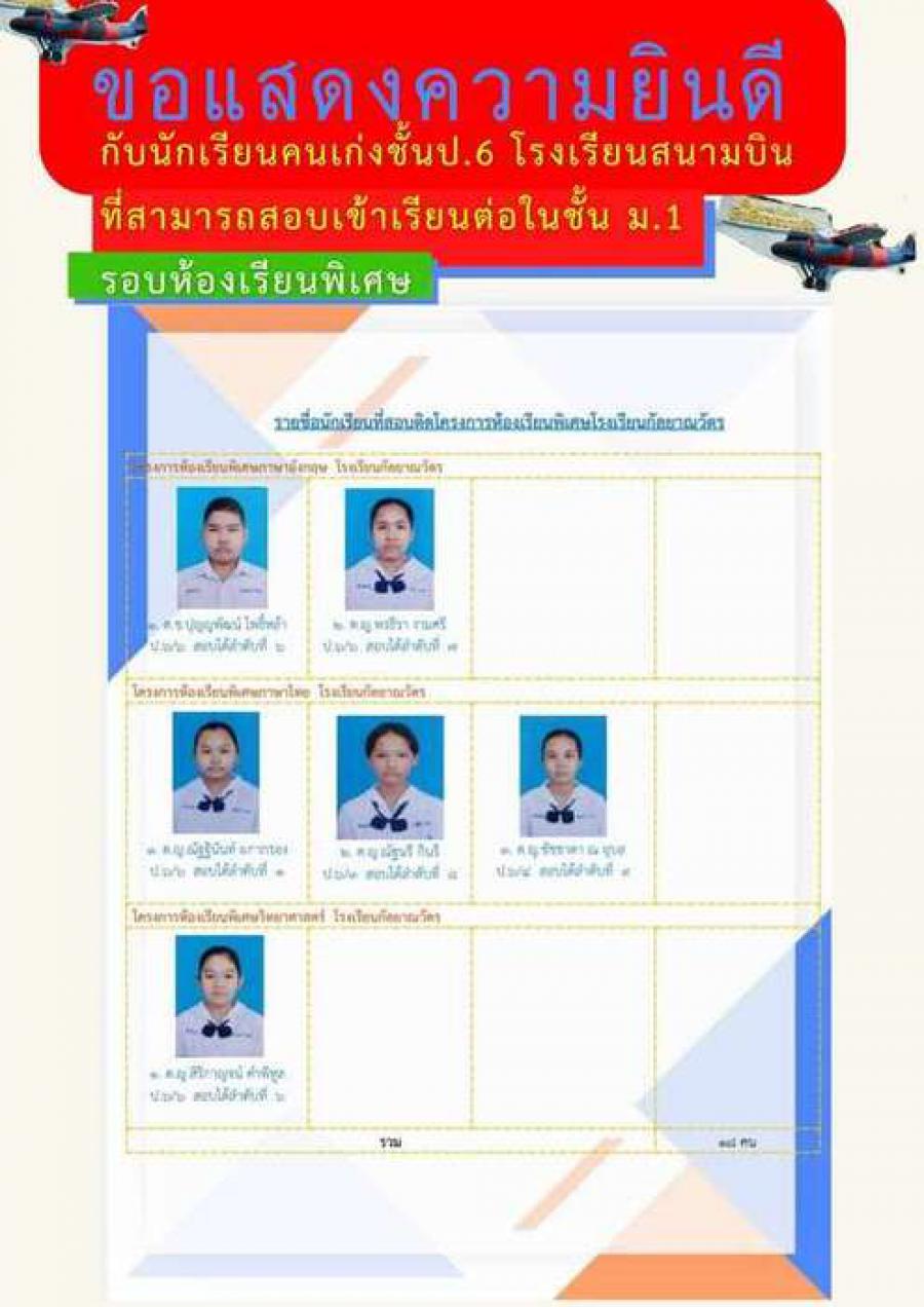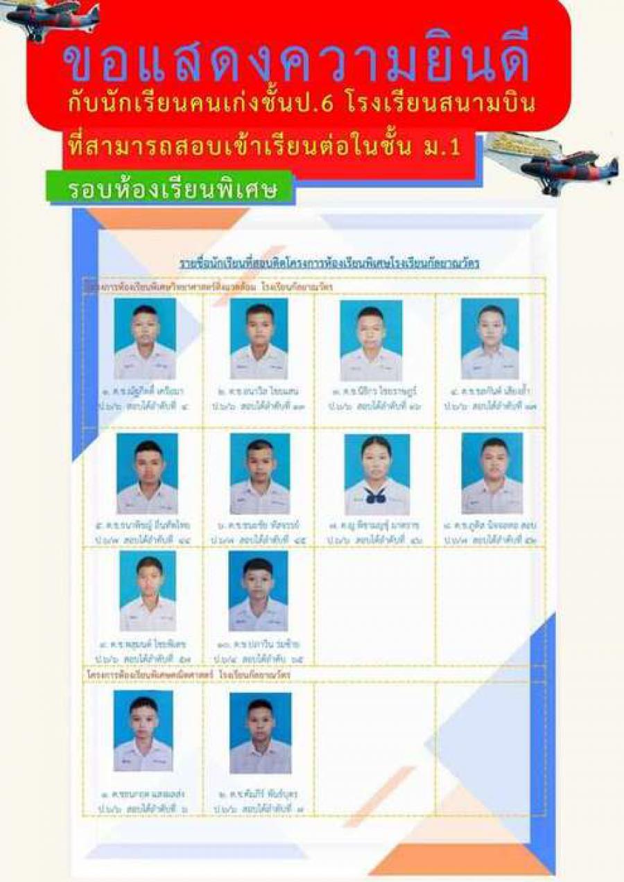 ขอแสดงความยินดีกับนักเรียนชั้นป. 6 โรงเรียนสนามบิน ที่สามารถสอบเข้าเรียนต่อในระดับชั้นม. 1 รอบห้องเรียนพิเศษ S:0