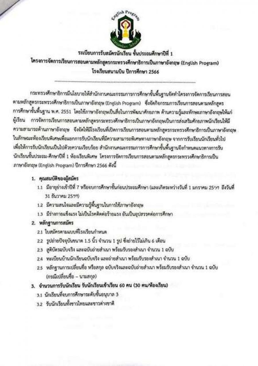 ระเบียบการรับสมัครนักเรียน ชั้นประถมศึกษาปีที่1 โครงการจัดการเรียนการสอนตามหลักสูตรกระทรวงศึกษาธิการเป็นภาษาอังกฤษ(English Program) โรงเรียนสนามบินปีการศึกษา 2566