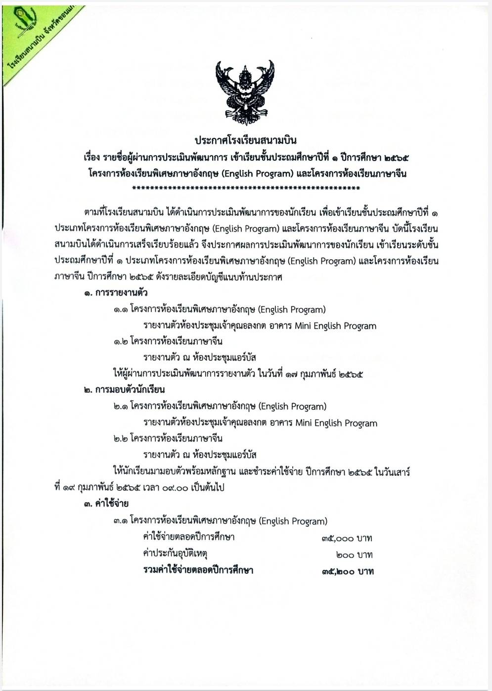 ประกาศรายชื่อผู้ผ่านการประเมินพัฒนาการ เข้าเรียนชั้นประถมศึกษาปีที่1 ปีการศึกษา 2565 โครงการห้องเรียนพิเศษภาษาอังกฤษ(English Program) และโครงการห้องเรียนภาษาจีน