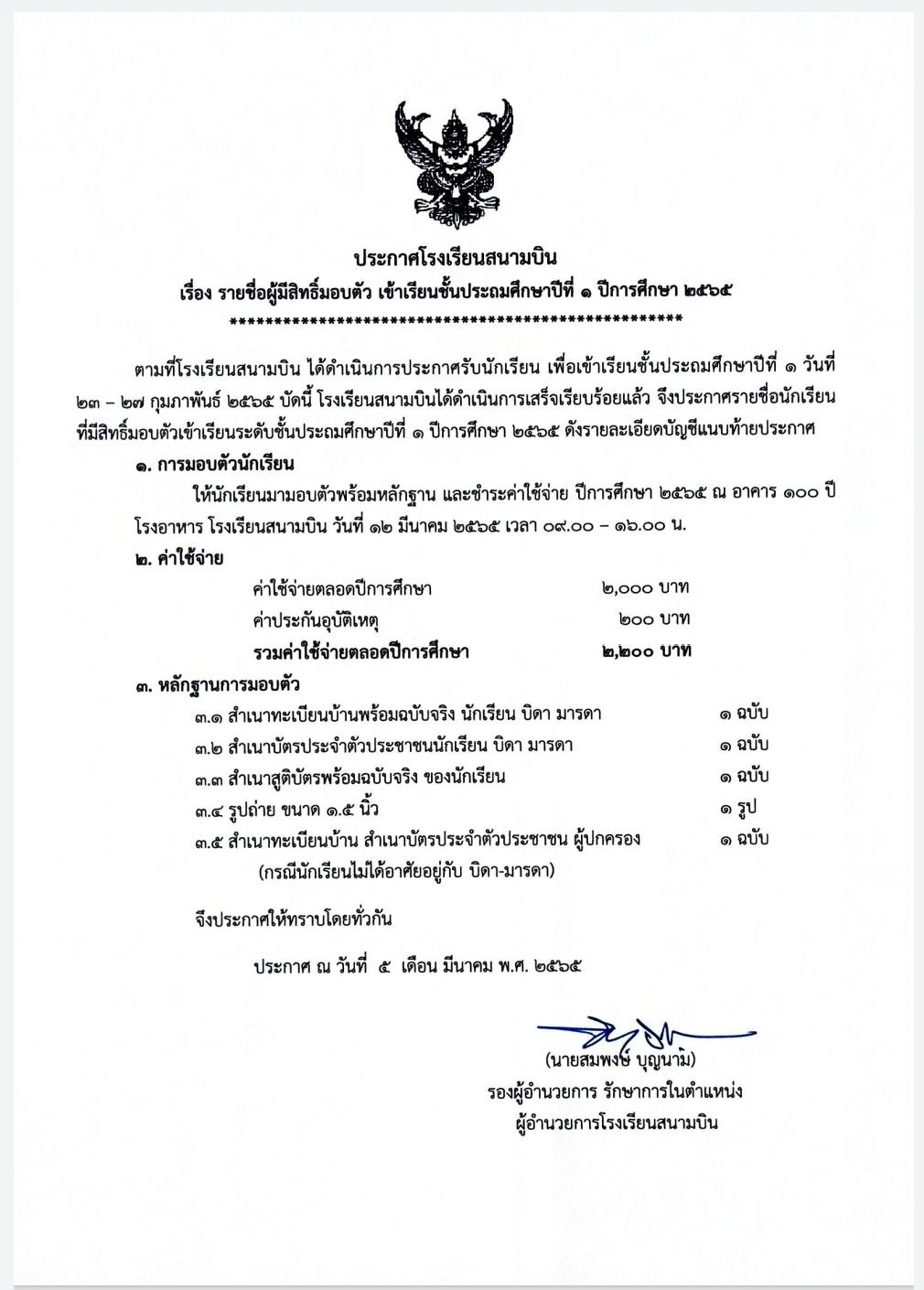 ประกาศรายชื่อผู้มีสิทธิ์มอบตัว เข้าเรียนชั้นประถมศึกษาปีที่ 1 ปีการศึกษา 2565