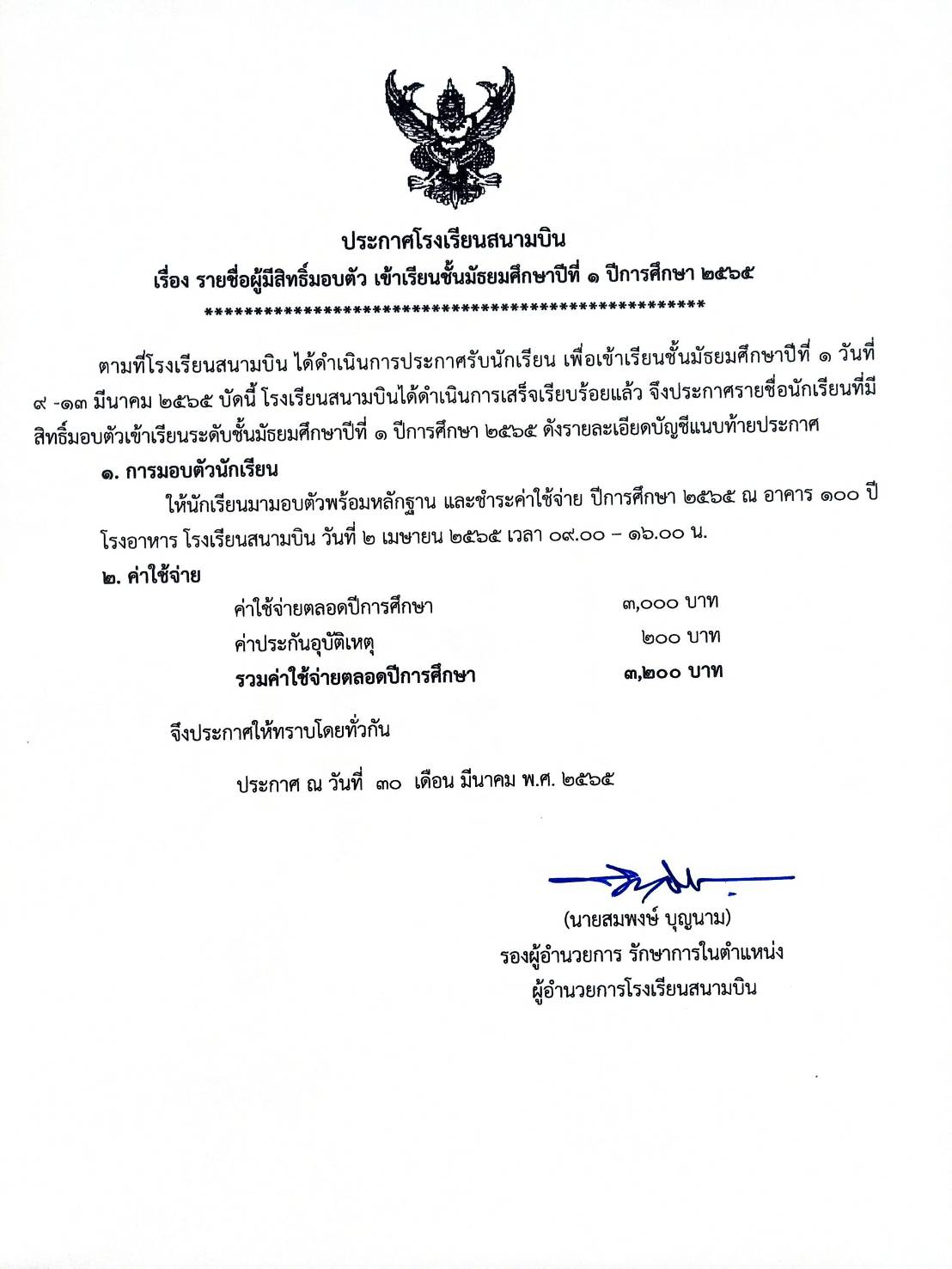 ประกาศรายชื่อผู้มีสิทธิ์มอบตัวเข้าเรียนในระดับชั้นมัธยมศึกษาปีที่ 1 ปีการศึกษา 2565