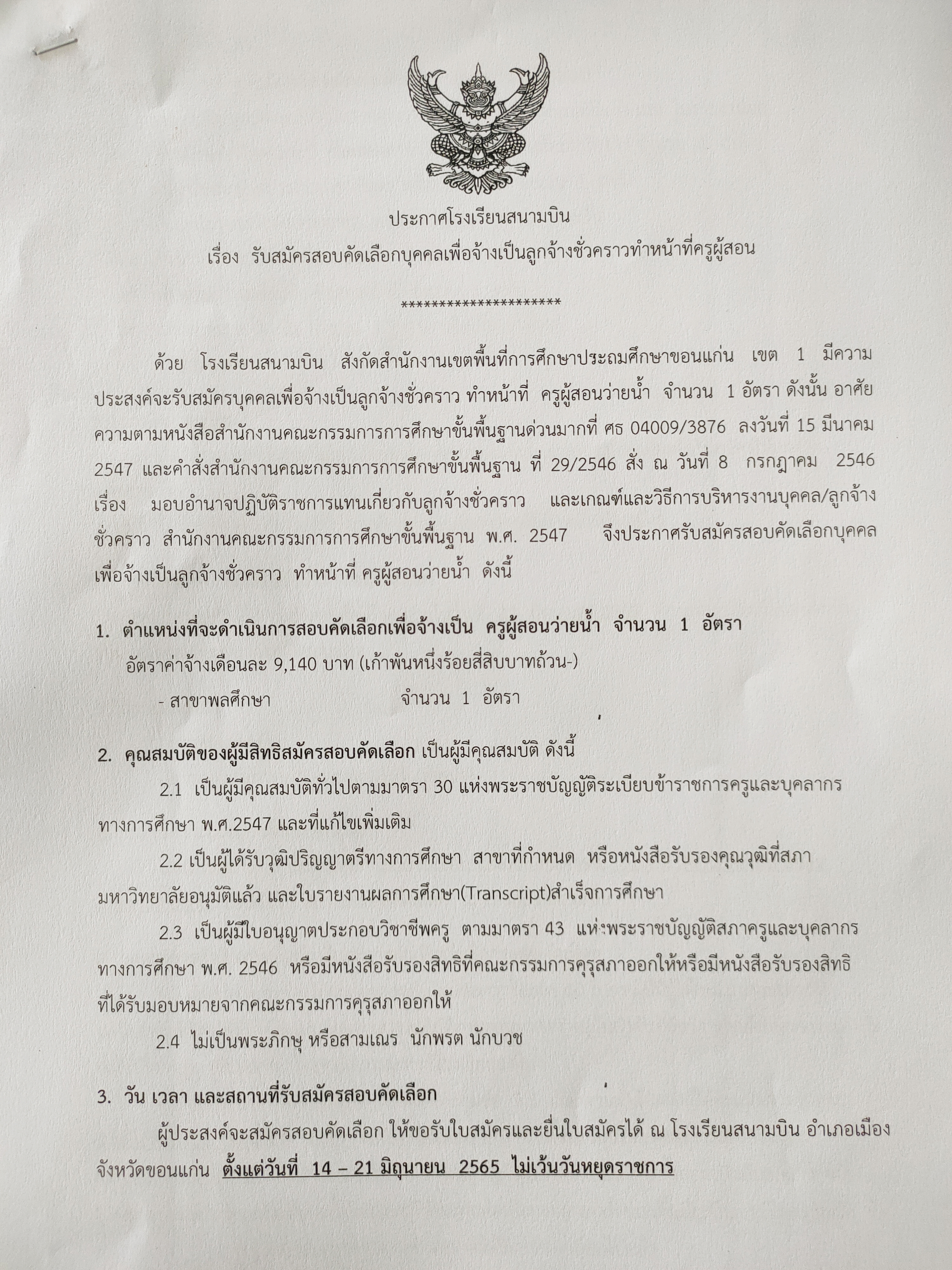 รับสมัครสอบคัดเลือกบุคคลเพื่อจ้างเป็นลูกจ้างชั่วคราวทำหน้าที่ครูผู้สอน