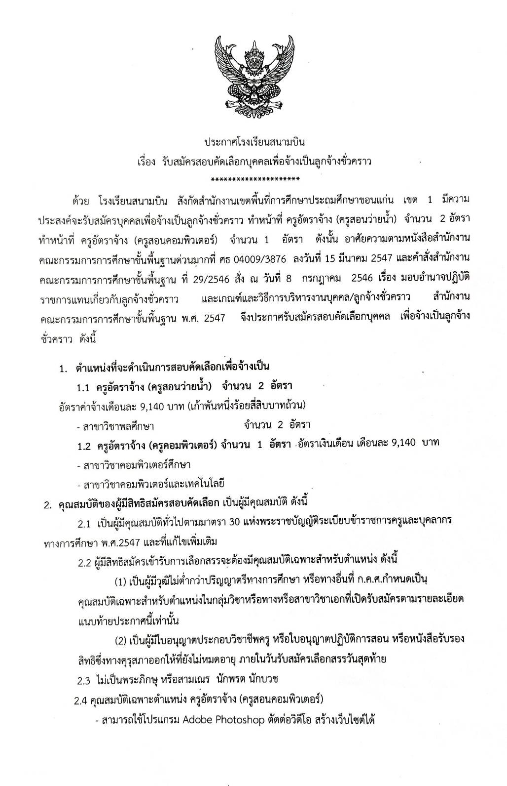 ประกาศโรงเรียนสนามบิน รับสมัครสอบคัดเลือกบุคคลเพื่อเป็นลูกจ้างชั่วคราว ตำแหน่ง ครูอัตราจ้าง (ครูว่ายน้ำ และ ครูคอมพิวเตอร์)