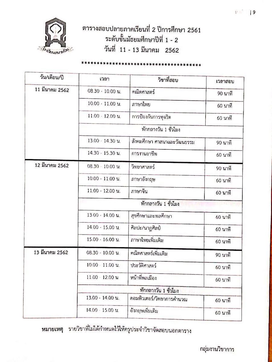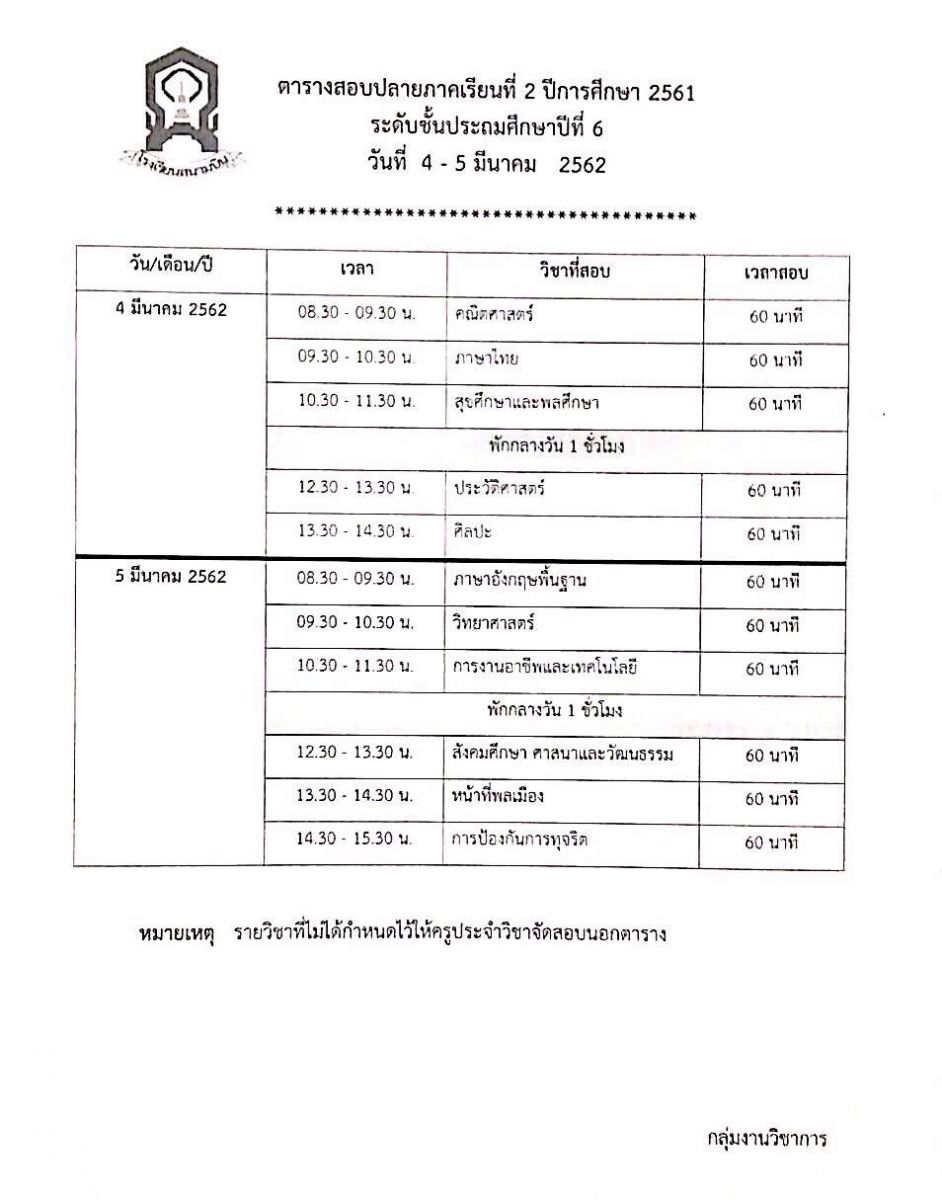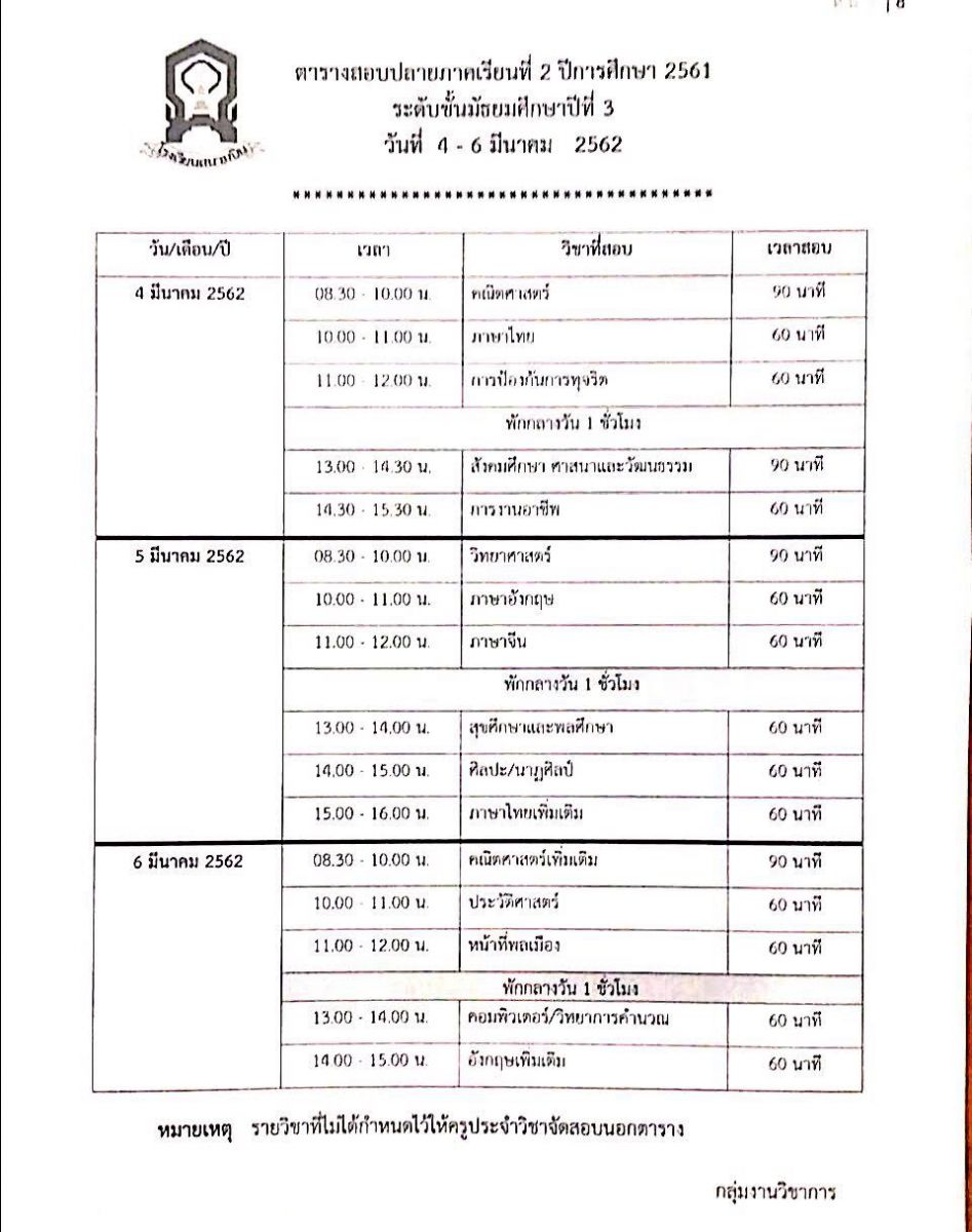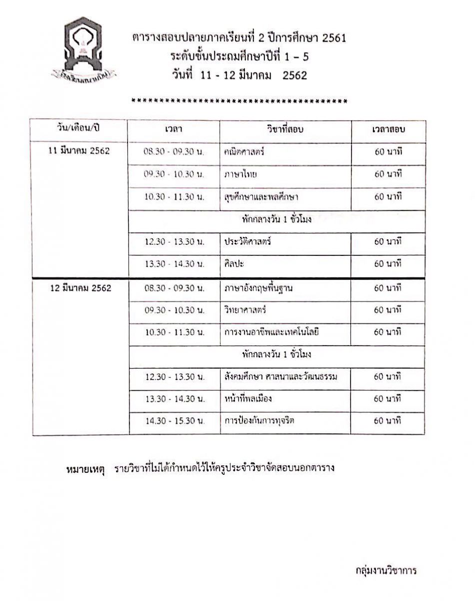 แจ้งกำหนดการสอบ ปลายภาคเรียนที่ 2 ปีการศึกษา 2561