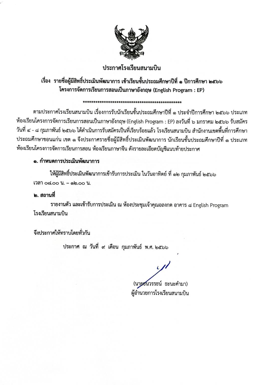 ประกาศ รายชื่อนักเรียนที่มีสิทธิ์ประเมินพัฒนาการ ป.1 ห้องเรียนโครงการพิเศษ EP