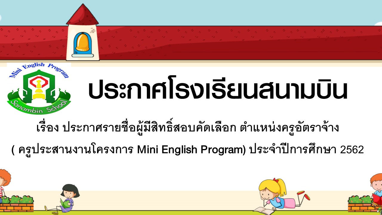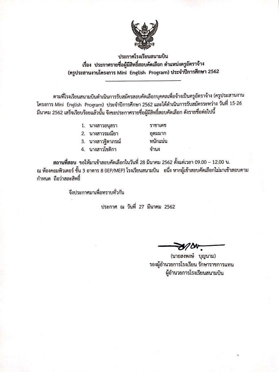 ประกาศรายชื่อผู้มีสิทธิ์สอบคัดเลือก ตำแหน่งครูอัตราจ้าง ( ครูประสานงานโครงการ Mini English Program) ประจำปีการศึกษา 2562