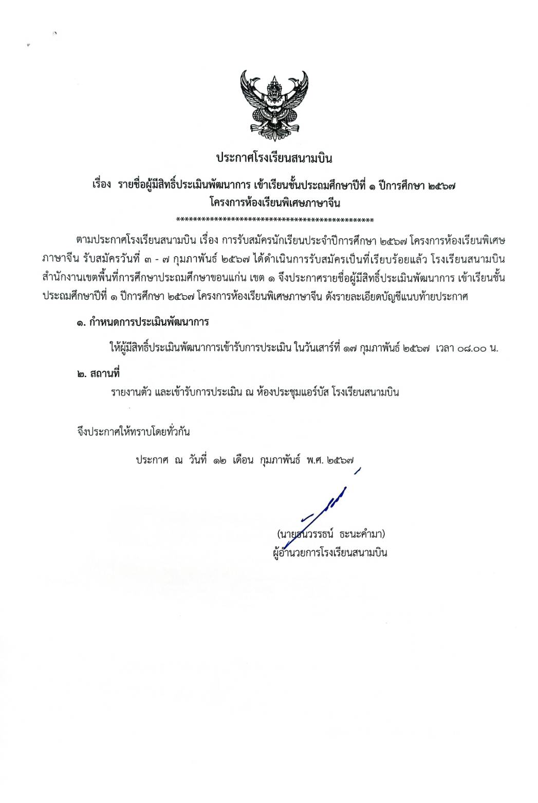 ประกาศ รายชื่อนักเรียนที่มีสิทธิ์ประเมินพัฒนาการ เข้าเรียนชั้นประถมศึกษาปีที่ 1 โครงการห้องเรียนภาษาจีน ปีการศึกษา 2567