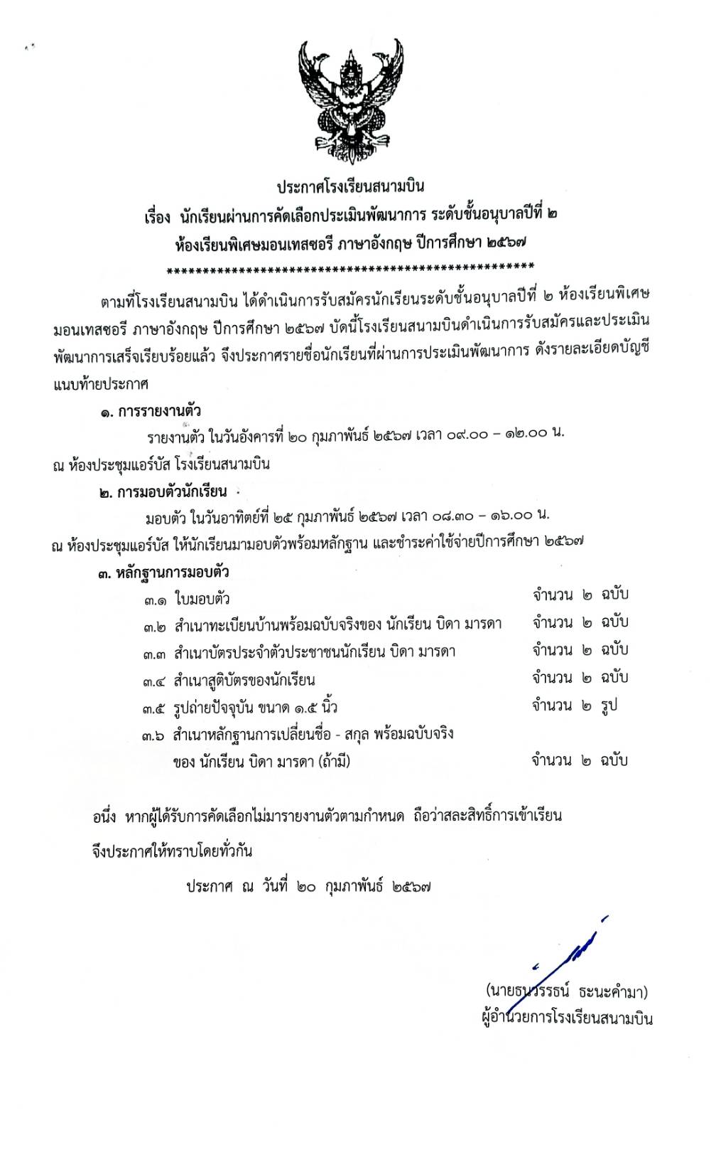 ประกาศ นักเรียนผ่านการคัดเลือกประเมินพัฒนาการ ระดับชั้นอนุบาลปีที่ 2 ห้องเรียนพิเศษมอนเทสซอรี ภาษาอังกฤษ ปีการศึกษา 2567