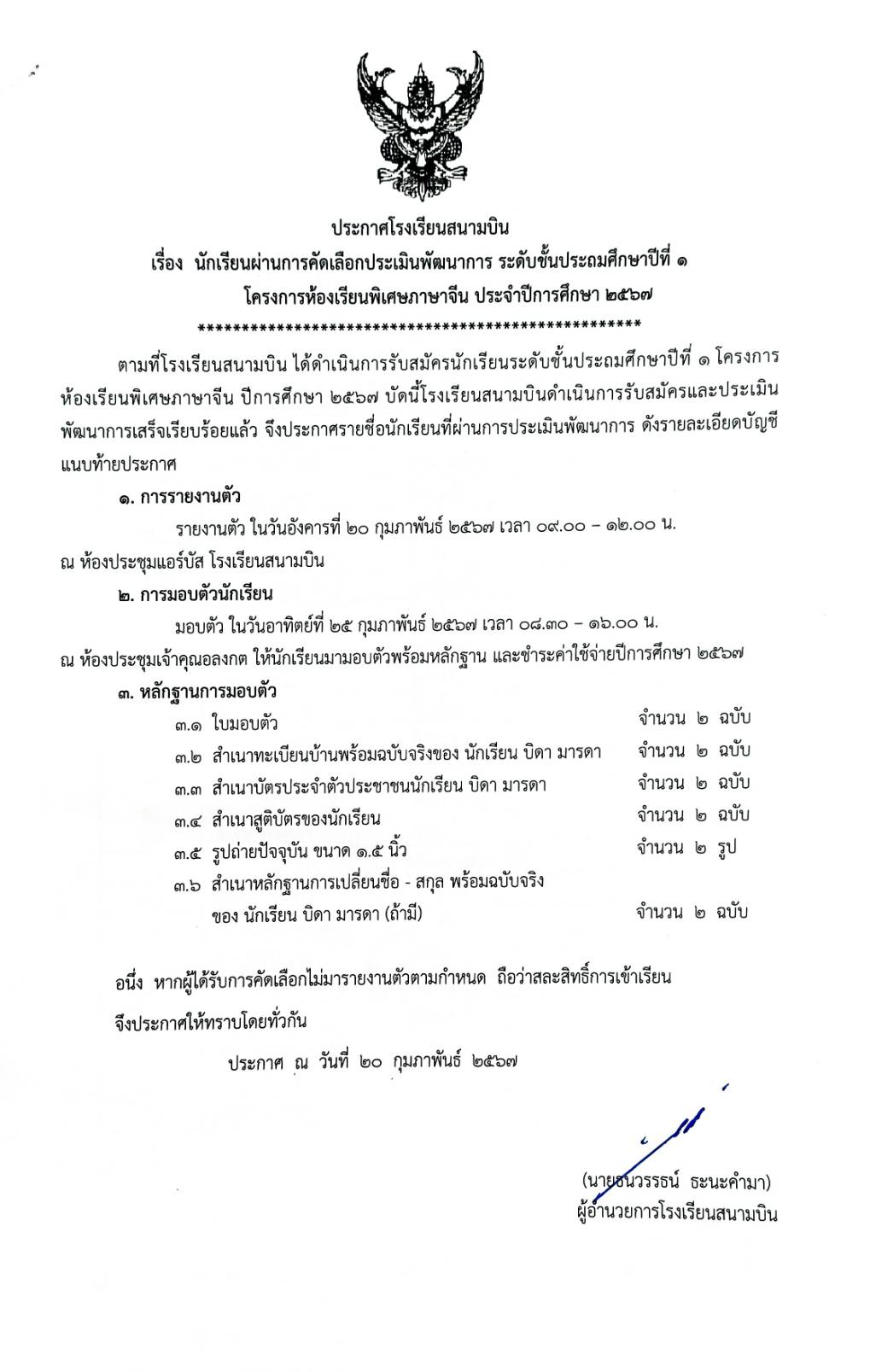 ประกาศ นักเรียนผ่านการคัดเลือกประเมินพัฒนาการ ระดับชั้นประถมศึกษาปีที่ 1 โครงการห้องเรียนพิเศษภาษาจีน ประจำปีการศึกษา 2567