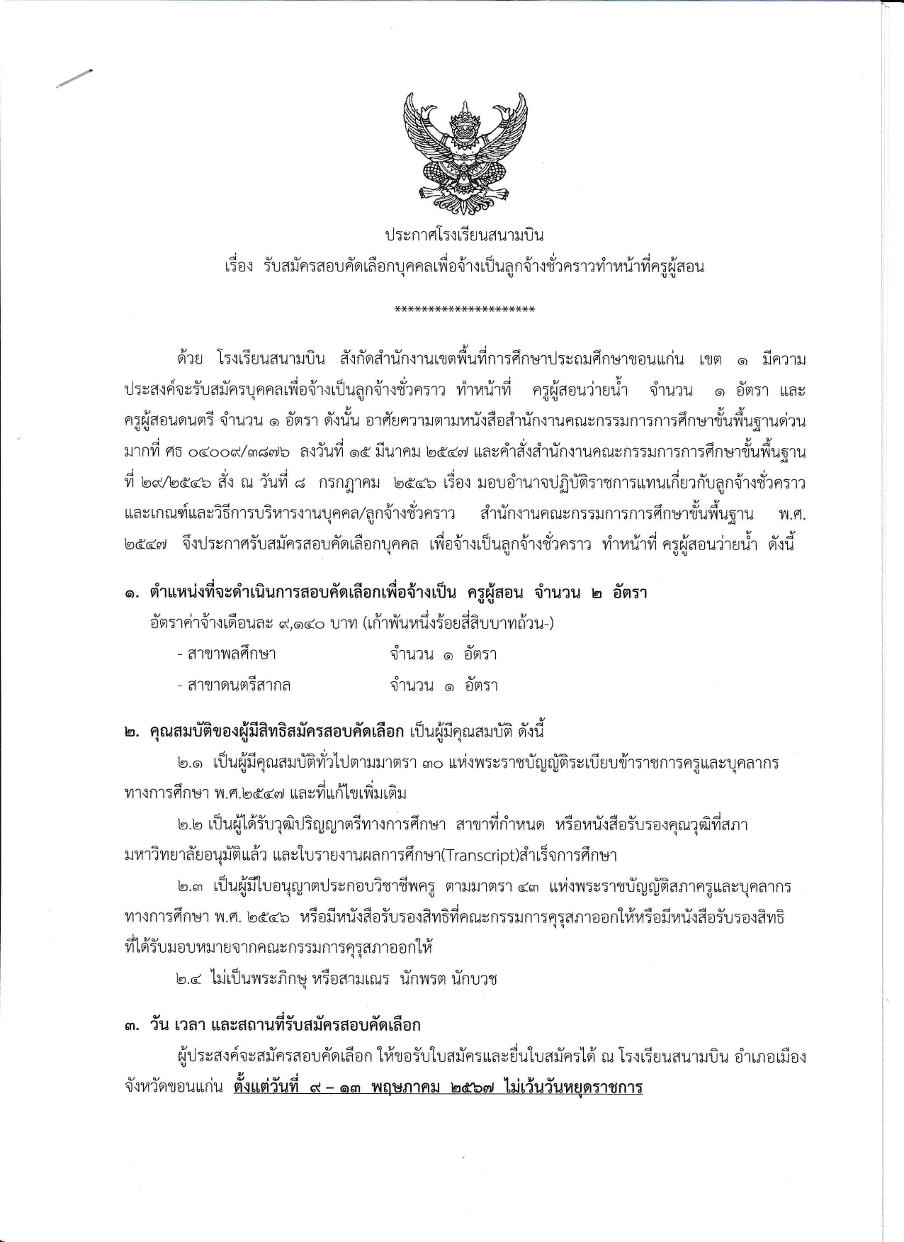 ประกาศรับสมัครคัดเลือกบุคคลเพื่อจ้างเป็นลูกจ้างชั่วคราวทำหน้าที่ครูผู้สอน 2 อัตรา