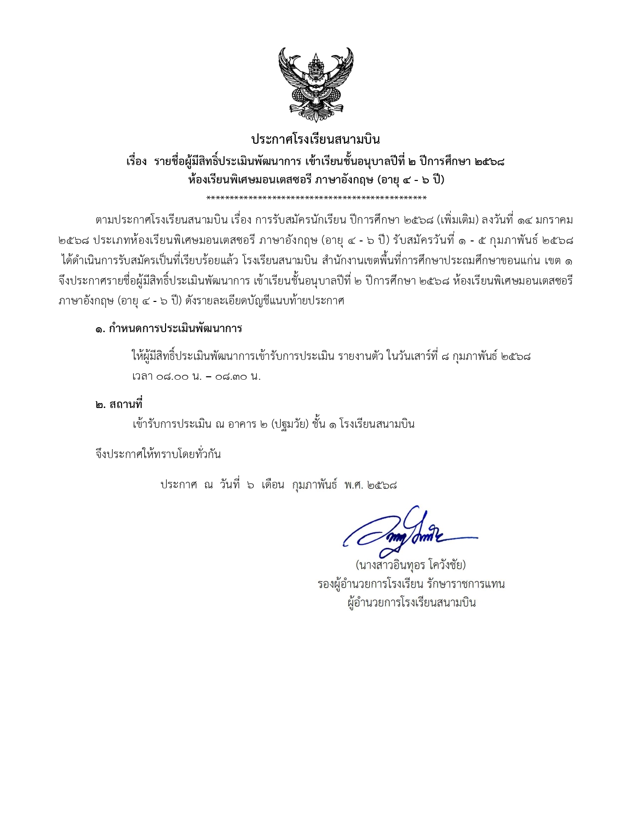ประกาศรายชื่อผู้มีสิทธิ์ประเมินพัฒนาการ เข้าเรียนชั้นอนุบาล 2 ปีการศึกษา 2568 ห้องเรียนพิเศษมอนเตสซอรี ภาษาอังกฤษ (อายุ 4 - 6 ปี)