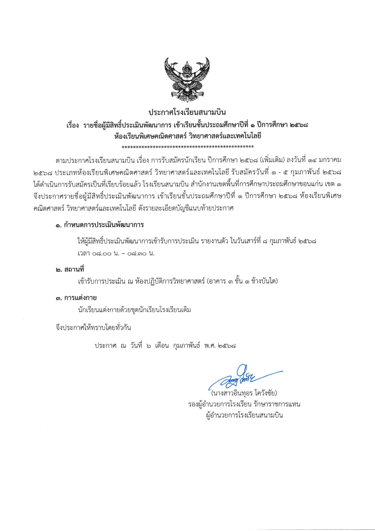 ประกาศรายชื่อผู้มีสิทธิ์ประเมินศักยภาพ เข้าเรียนชั้นประถมศึกษาปีที่ 1 ปีการศึกษา 2568 ห้องเรียนพิเศษคณิตศาสตร์ วิทยาศาสตร์และเทคโนโลยี