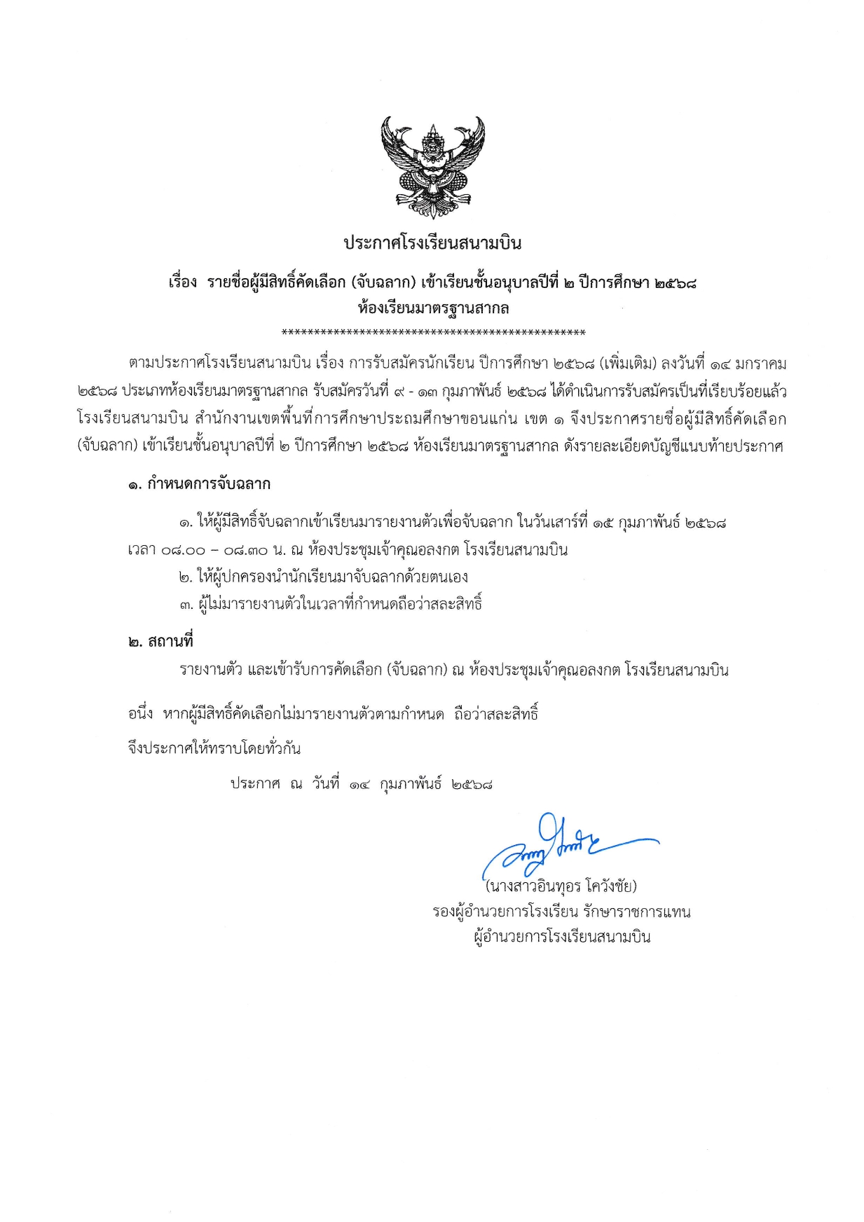 ประกาศ รายชื่อผู้มีสิทธิ์คัดเลือก (จับฉลาก) เข้าเรียนชั้นอนุบาลปีที่ 2 ปีการศึกษา 2568 ห้องเรียนมาตรฐานสากล