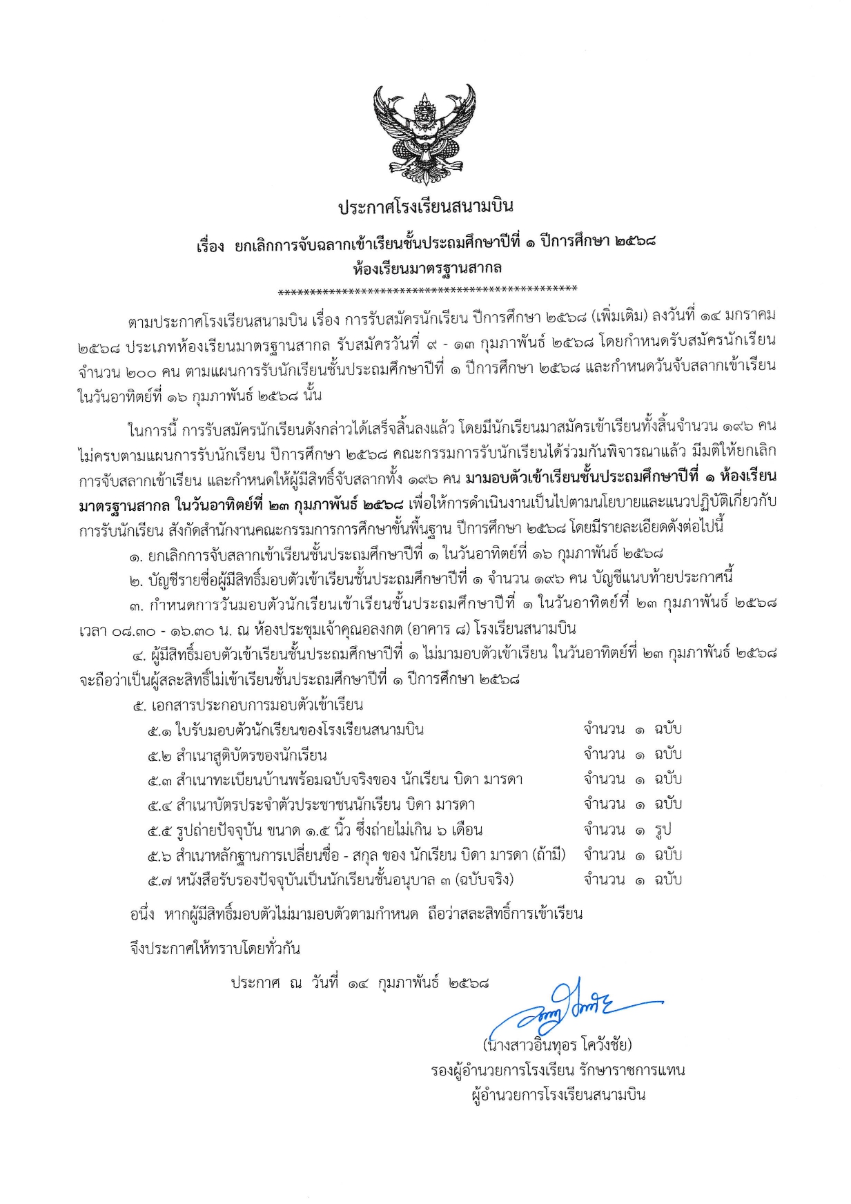 ประกาศ ยกเลิกการจับฉลากเข้าเรียนชั้นประถมศึกษาปีที่ 1 ปีการศึกษา 2568 ห้องเรียนมาตรฐานสากล