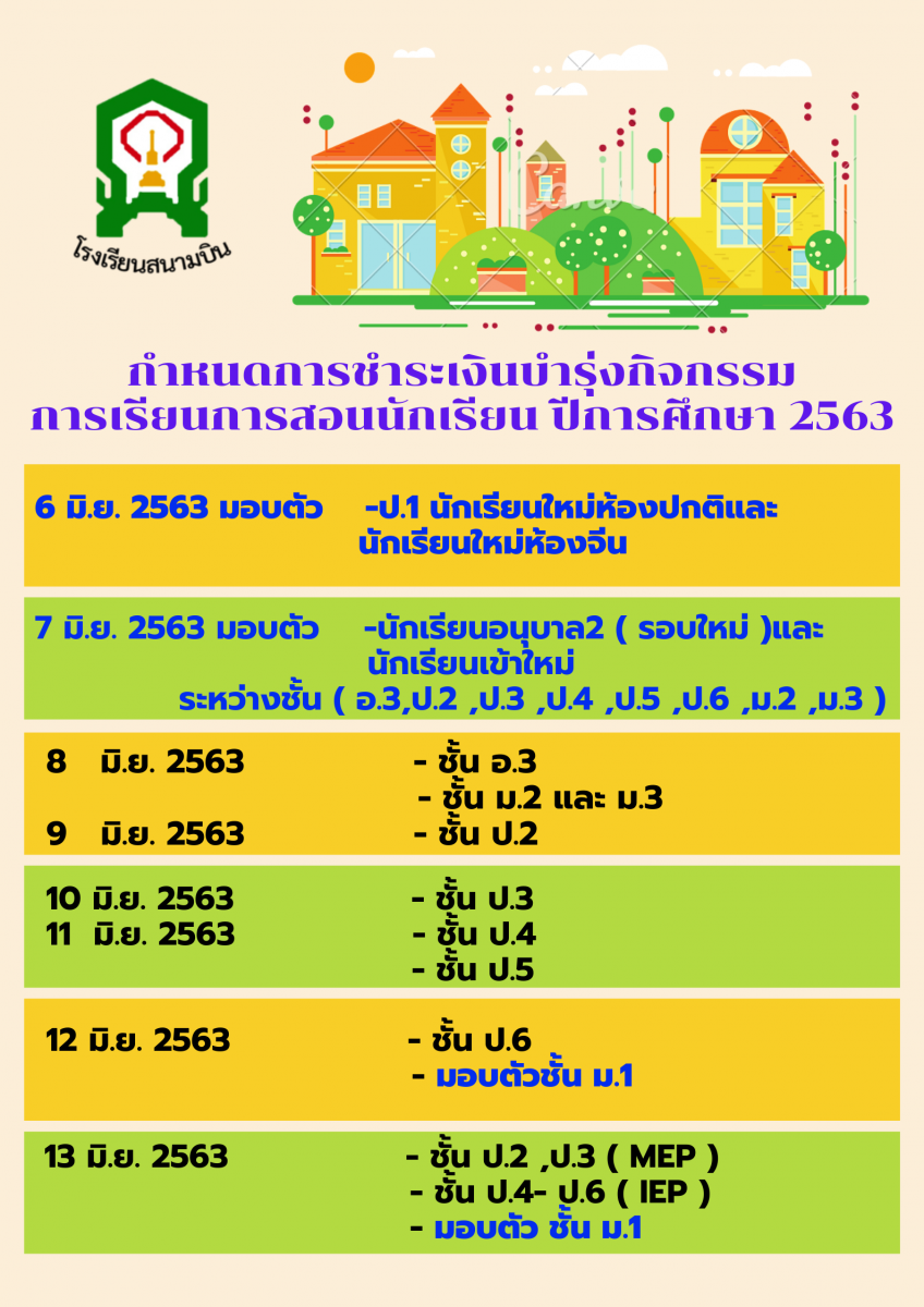 กำหนดการชำระเงินบำรุ่งกิจกรรม การเรียนการสอนนักเรียน ปีการศึกษา 2563