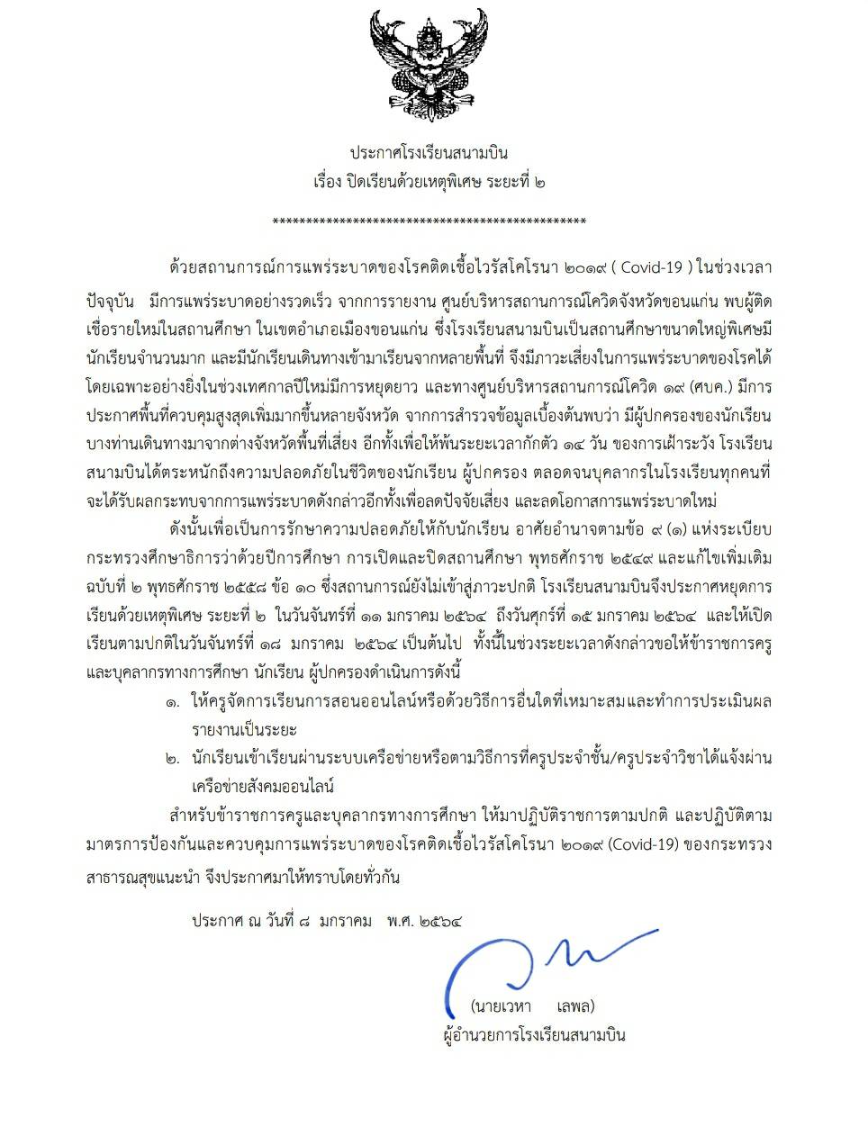 ประกาศปิดเรียนด้วยเหตุพิเศษระยะที่ 2 วันที่ 11-15 มกราคม 2564