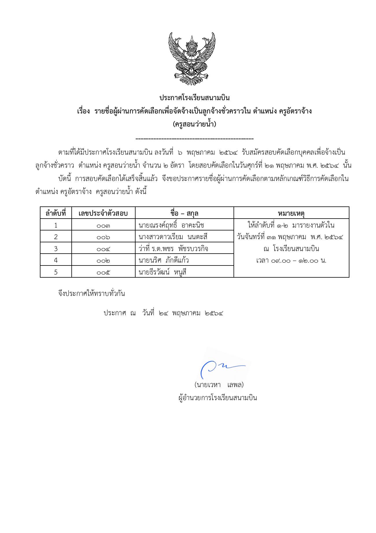 ประกาศรายชื่อบุคคลเพื่อจ้างเป็นลูกจ้างชั่วคราว ทำหน้าที่ครูสอนว่ายน้ำ โดยให้ลำดับที่ 1-2 มารายงานตัวในวันจันทร์ที่ 31 พฤษภาคม 2564 ณ โรงเรียนสนามบิน เวลา 09.00-12.00 น.
