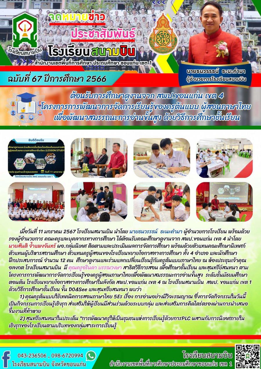 ต้อนรับการศึกษาดูงานจาก สพป.ขอนแก่น เขต 4 โครงการการพัฒนาการจัดการเรียนรู้ของครูต้นแบบ ผู้สอนภาษาไทย เพื่อพัฒนาสมรรถนะการอ่านขั้นสูง ด้วยวิธีการศึกษาชั้นเรียน