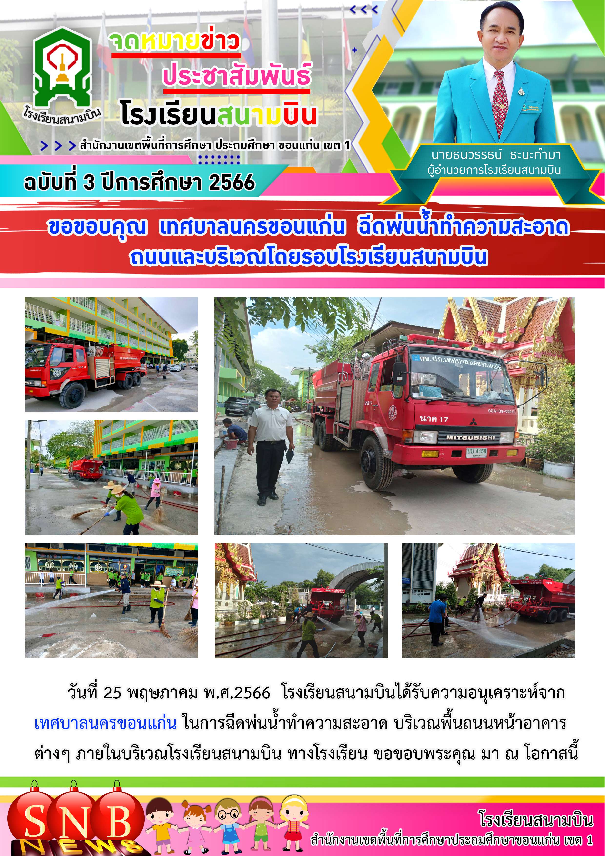 ขอขอบคุณ เทศบาลนครขอนแก่น ฉีดพ่นน้ำทำความสะอาดถนนและบริเวณโดยรอบโรงเรียนสนามบิน