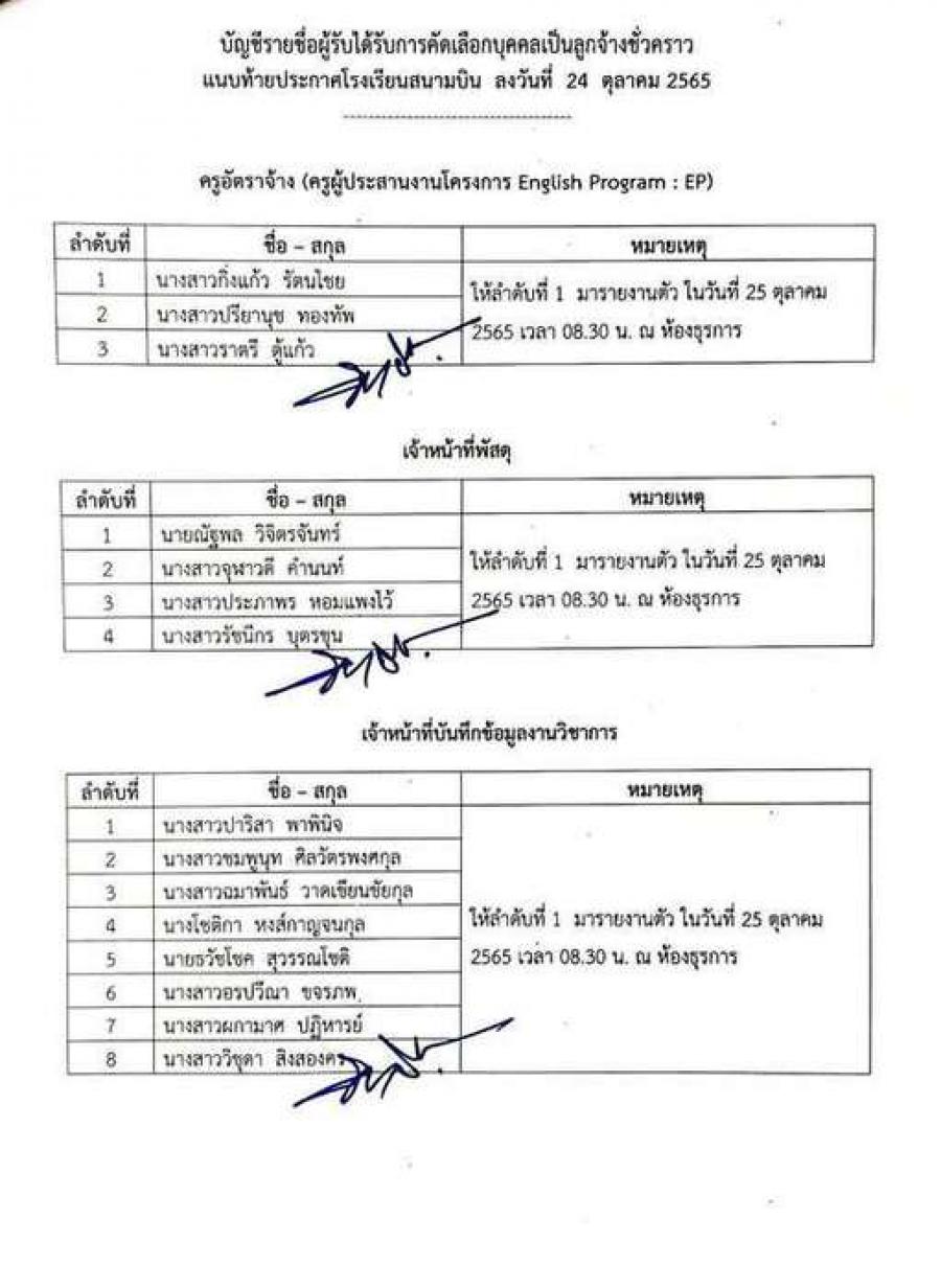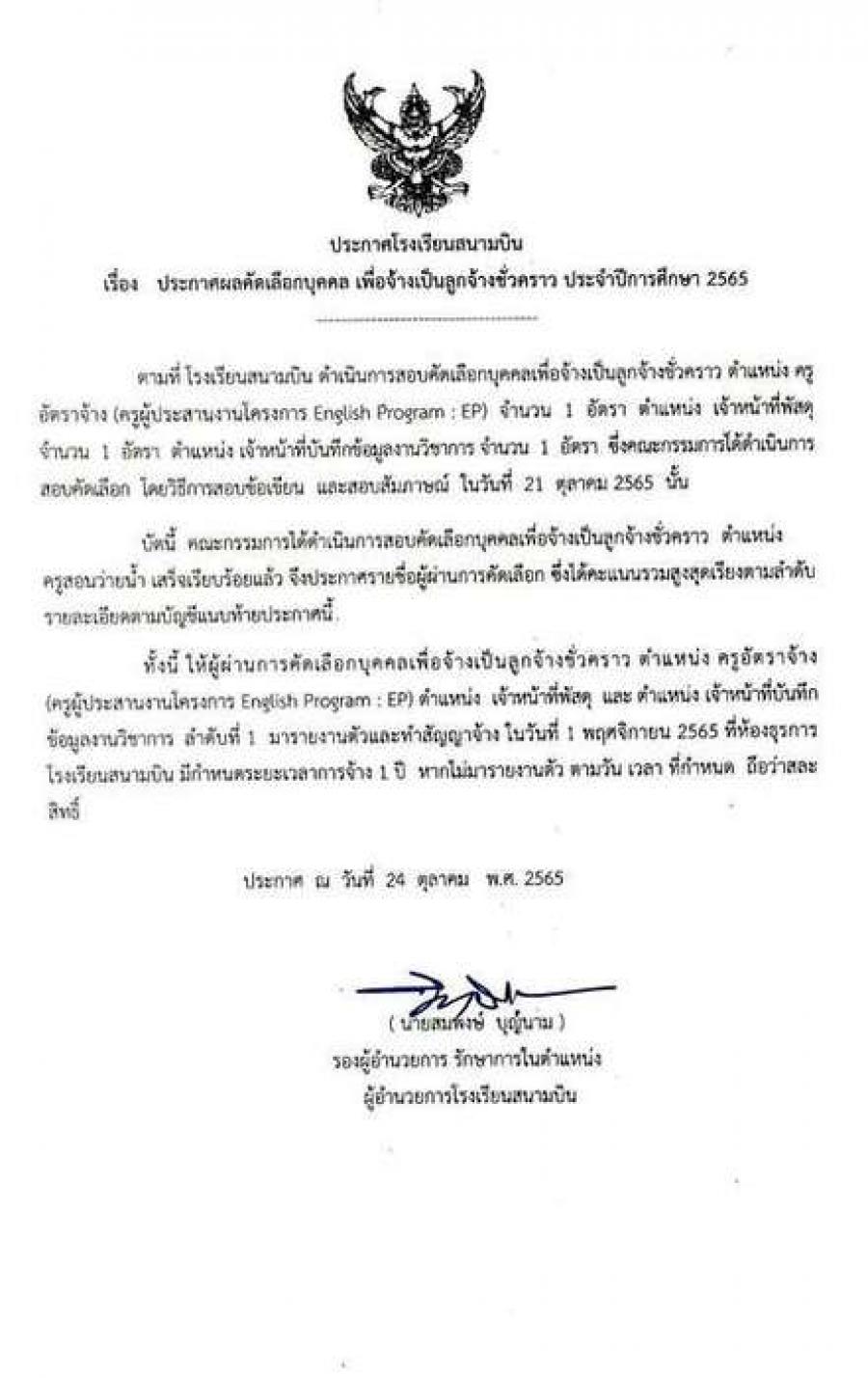 ประกาศโรงเรียนสนามบิน ผลการคัดเลือกบุคคลเพื่อเป็นลูกจ้างชั่วคราว S:0