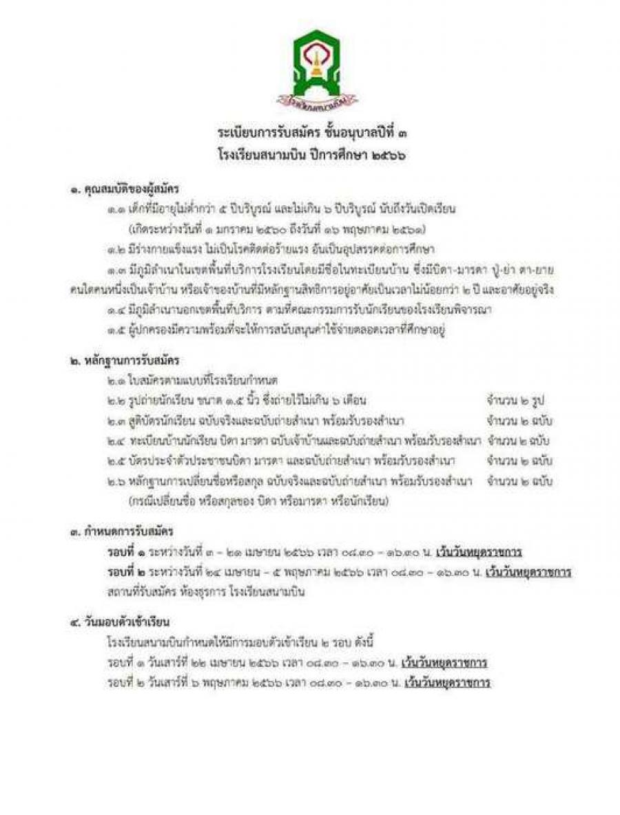 ระเบียบการรับสมัคร ชั้นอนุบาลปีที่๓ โรงเรียนสนามบินปีการศึกษา ๒๕๖๖