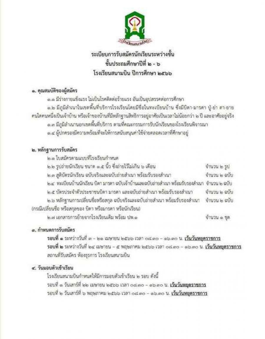 ระเบียบการรับสมัครนักเรียนระหว่างชั้น ชั้นประถมศึกษาปีที่ ๒-๖ โรงเรียนสนามบิน ปีการศึกษา ๒๕๖๖